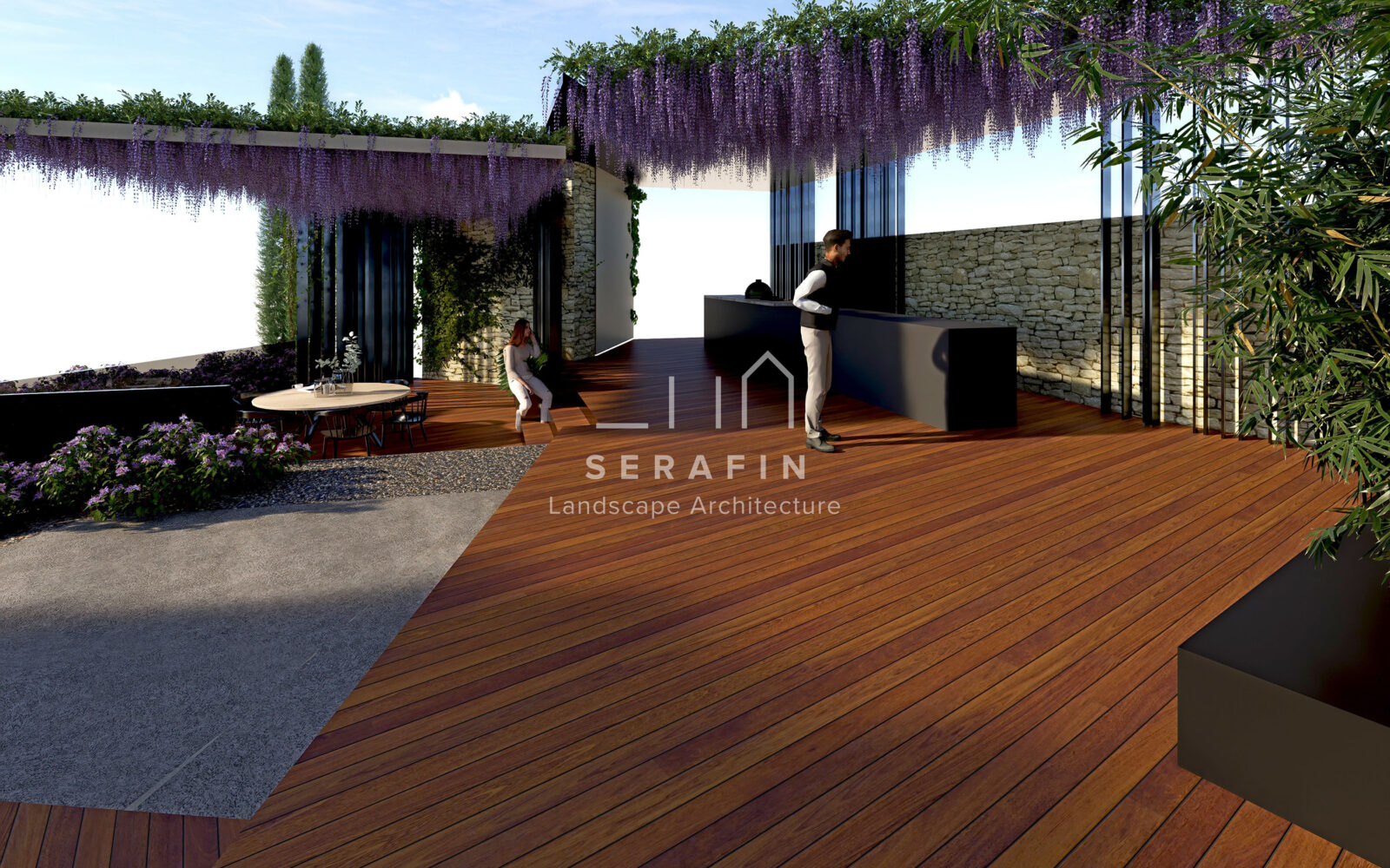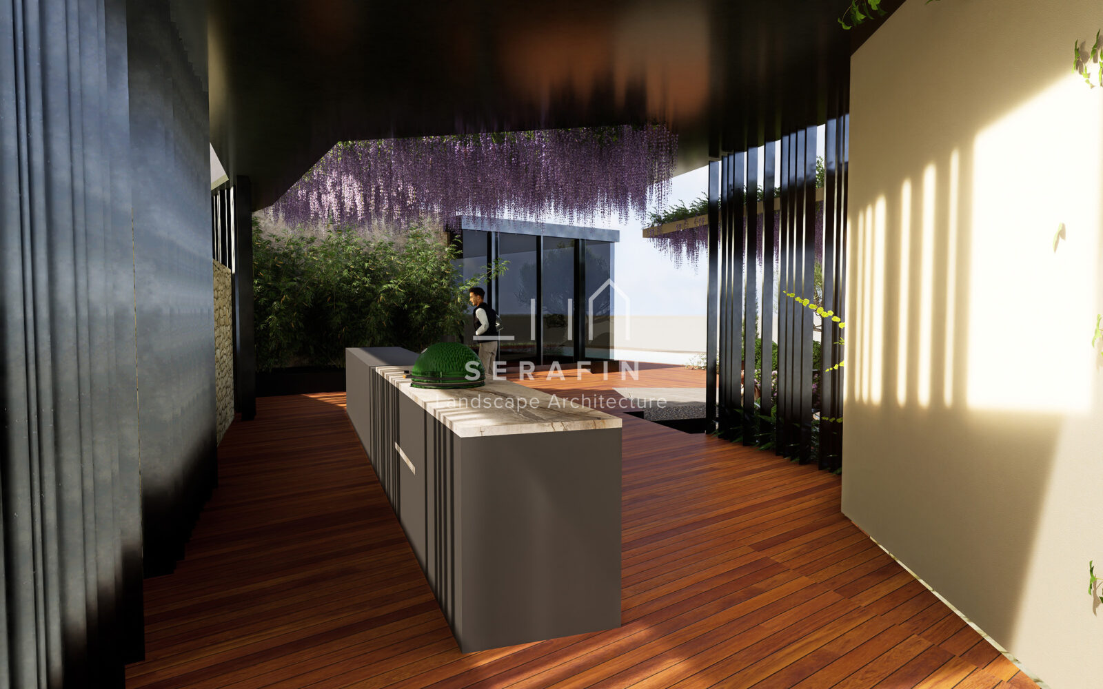 New metal structures were inserted to mitigate and define this space, surrounded by flowerbeds with summer blooms and exemplary trees. An outdoor kitchen also found its place inside this new outdoor oasis.